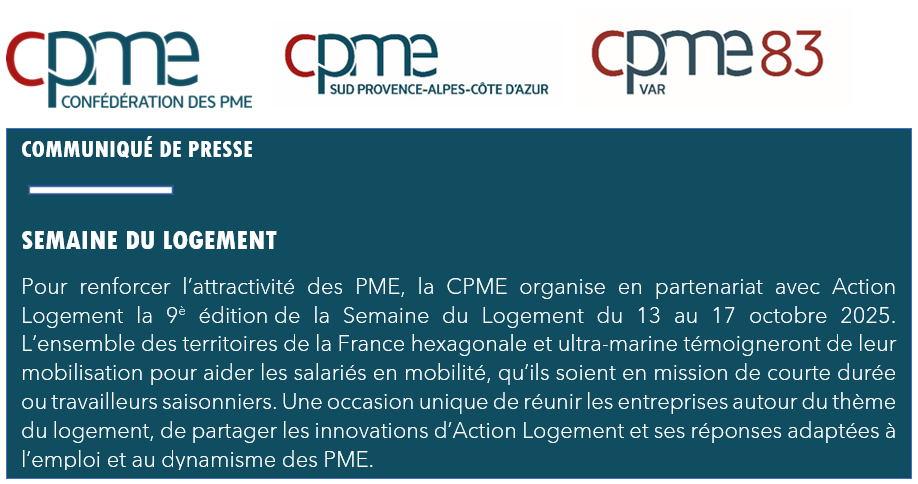 La CPME nationale et ses Unions régionales et des Départements et régions d’Outre-mer ont à cœur de les partager avec l’ensemble des entreprises du 13 au 17 octobre 2025. En partenariat avec Action Logement, elles sont fières de convier les chefs d’entreprises à la 9ème édition de la Semaine du Logement.